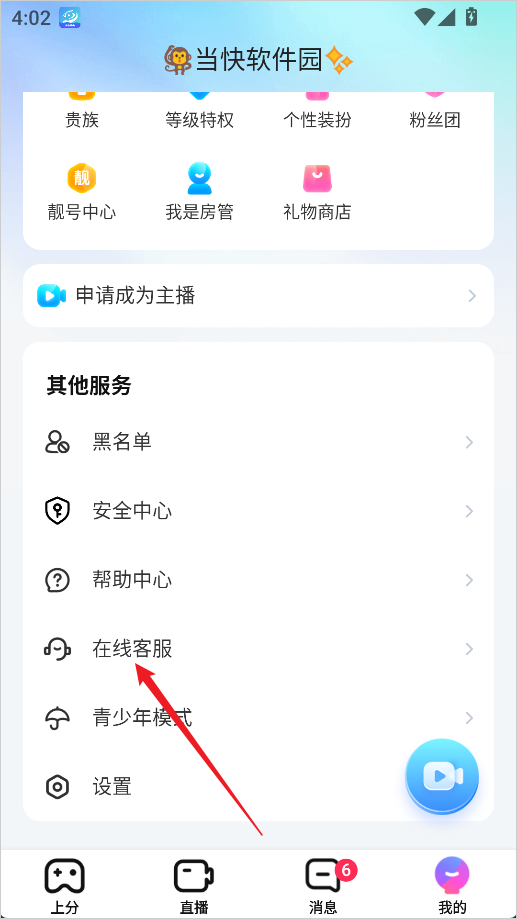 1、在个人主页位置点击下方的在线客服;