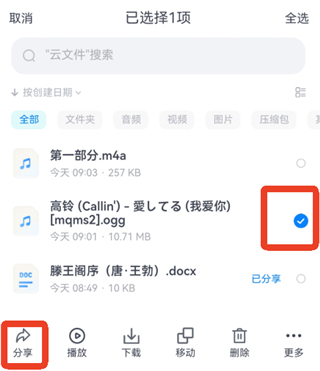 2、点击文件右边的圆圈,勾选文件,再点击下方第一个【分享】。