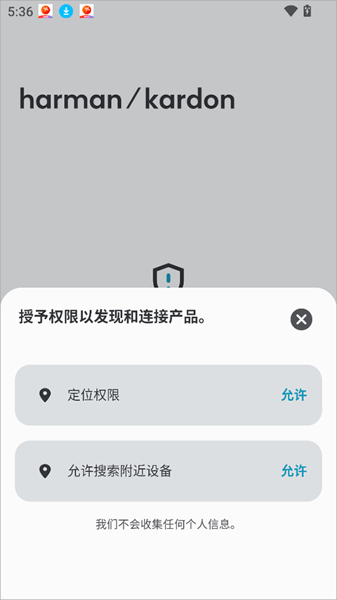 1、开启音箱设备后,打开app后首先授予app定位和搜索设备的权限