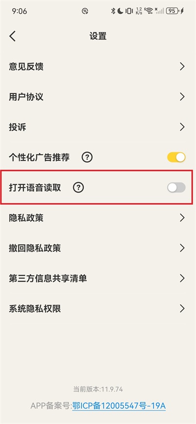 3、找到下方"打开语音读取",点击按键由灰色变成黄色即可打开文字朗读功能。