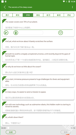 3、熟练聆听文章后,可选择评测功能,合成个人英语语音,通过自读自听发现发音问题。