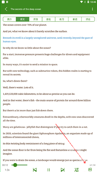 2、软件支持在线播放原文,可对照中英文理解文章含义,也可隐藏中文仅显示英文。