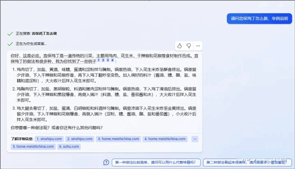 可以看出新必应的回答并没有直接将做法呈现出来,这与提问的问题有一定关系。换种方式提问: