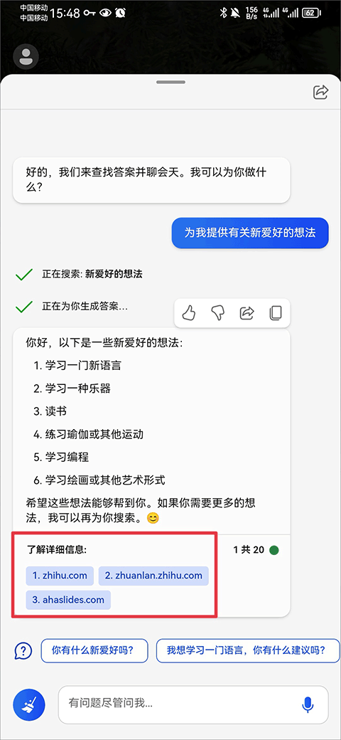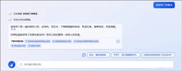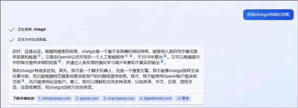 它会搜索网页中的信息,快速回复用户。它会显示出来参考了哪些网址,就是下面的【了解详细信息】栏。这里能看到再问问题时,尽量描述清楚,系统在接受指令时,会根据指令详细程度做出不同回答。