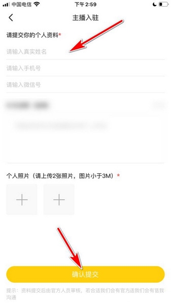 输入个人资料后,点击下方确认提交的按钮即可申请成为主播。
