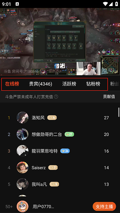 3、然后会弹出各种榜单界面,【在线榜】会根据用户的贡献值来排序;
