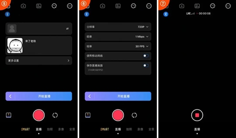 1、打开ZY CAMI连上设备,主界面底下那个菜单栏,左右滑一下就能找到“直播”入口。大家看下面这张截图,进去之后就能看到快手直播、Restream和RTMP推流这几个选项。