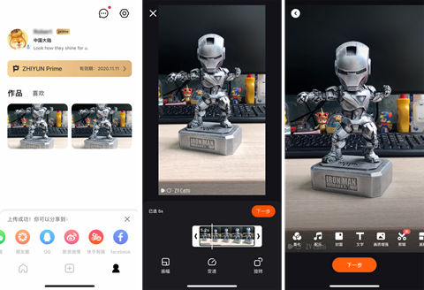 2、要是觉得视频还差点意思,想再精修一下,这app也给你想到了。视频在ZY CAMI里发布之后,底下会弹个分享窗口,你瞅瞅下面这张截图。点那个「快手剪辑」按钮,它就会带着你的视频直接跳到快手app的剪辑界面里,让你进行二次创作。你可以先调整下画幅、速度,然后点下一步再加点美颜、音乐、文字啥的。讲真,这个无缝衔接的功能确实贴心。