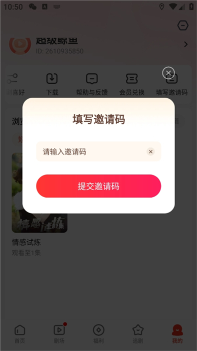 3、准确输入邀请码,注意区分大小写,点击提交即可。