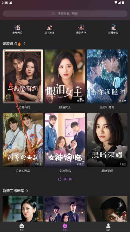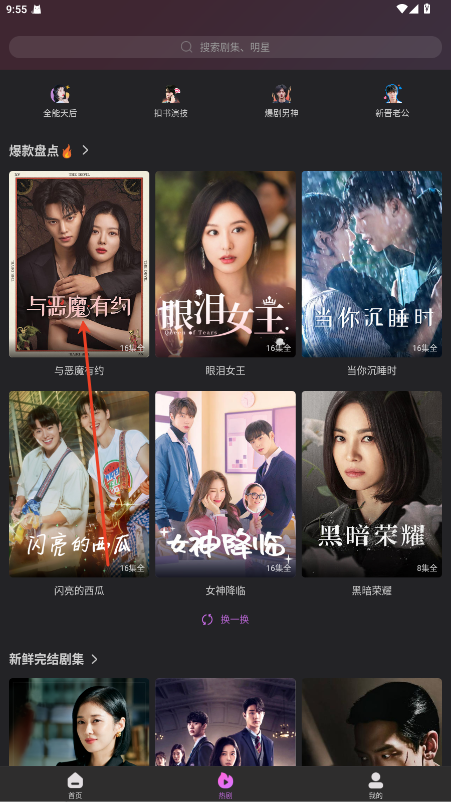 1、在韩站官方app首页中有四大版块,分别是韩剧、广场、推荐和明星,在韩剧中就可以发现时下热门好剧,精选热剧、青葱少年时等各种分类;