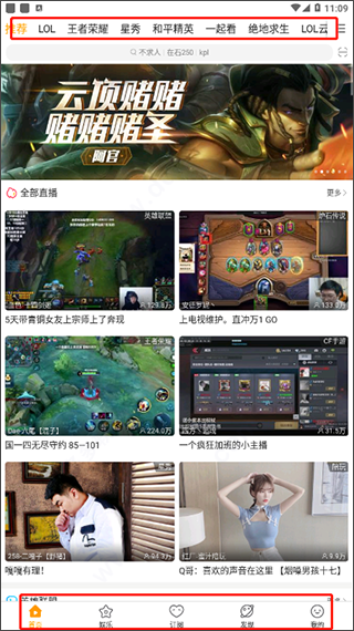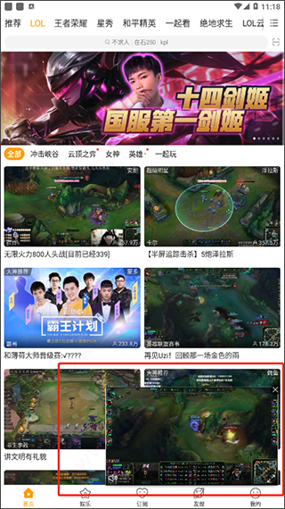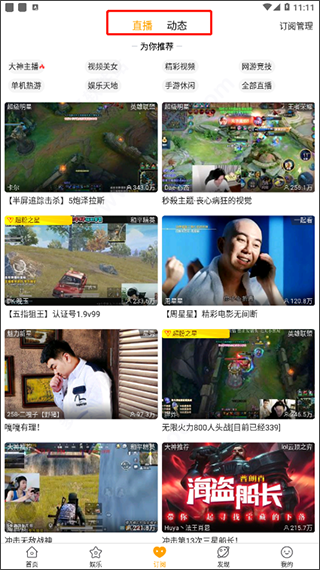 1、下载安装好虎牙直播青春版后即可运行使用,可以看到软件主要划分成为首页、娱乐、订阅、发现、我的五大部分,在首页可看到海量不同游戏类型的直播内容;