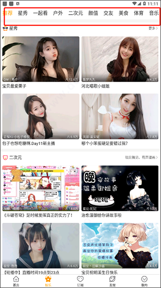 2、而在“娱乐”中就是各式各样的直播内容了,并在上分有对其进行划分,以便快速找到你想看的直播;